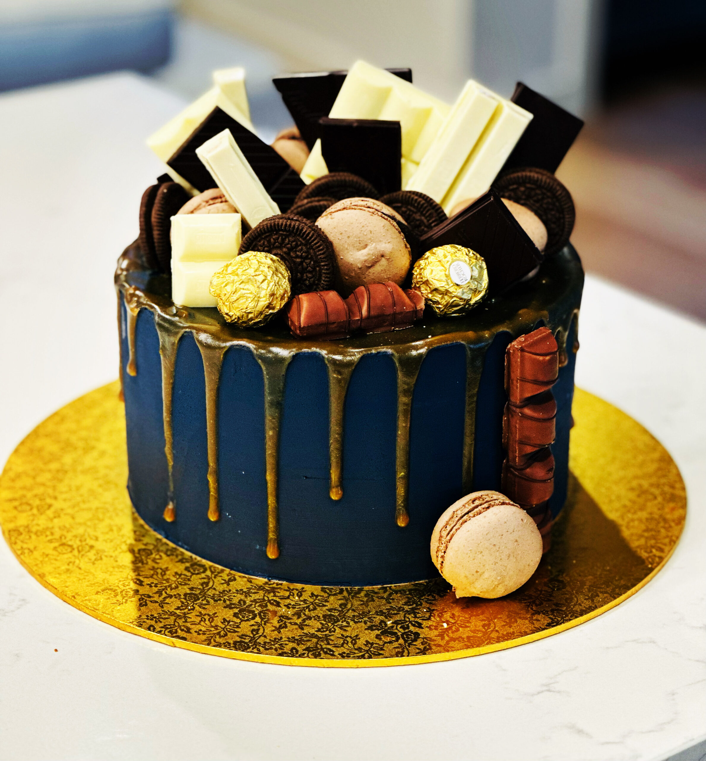 NAVY BLUE FONDANT CAKE WITH AN ARRAY OF CHOCOLATES, OREO COOKIES AND CHOCOLATE MACAROONS WITH A CARAMEL DRIP.